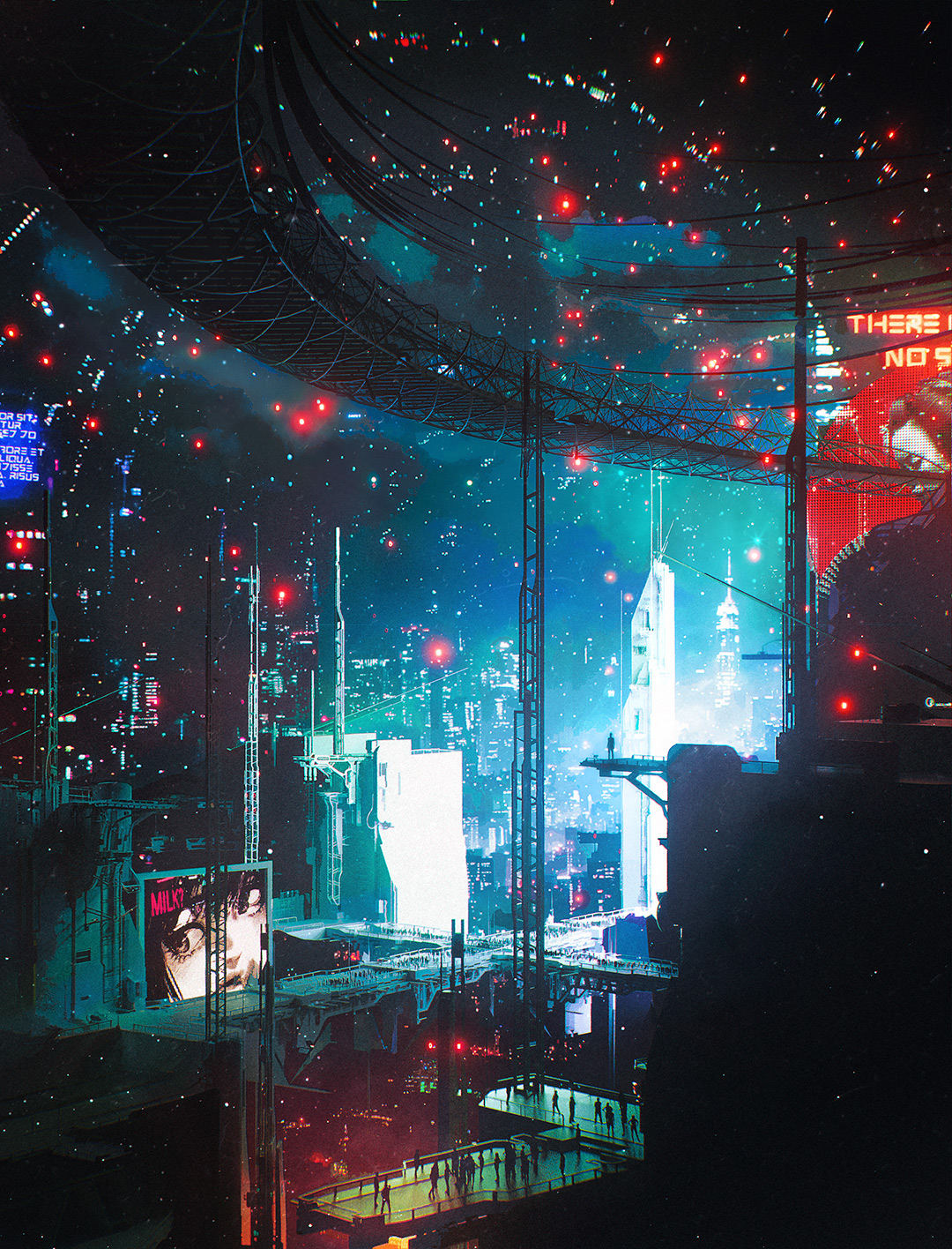 “In the neon-lit labyrinth of a dystopian future, where the digital and organic coalesce into a seamless continuum, arises a visionary: Dangiuz. His art is a beacon in the murky fog of corporate dominion and digital despotism, a rebellion against the cold calculus of a data-driven world. Through his romantic cyberpunk oeuvre, Dangiuz redefines our perception of technology and humanity, intertwining the two in a narrative of resilience, beauty, and love.” — W.S. Yang in "The world can be so beautiful"